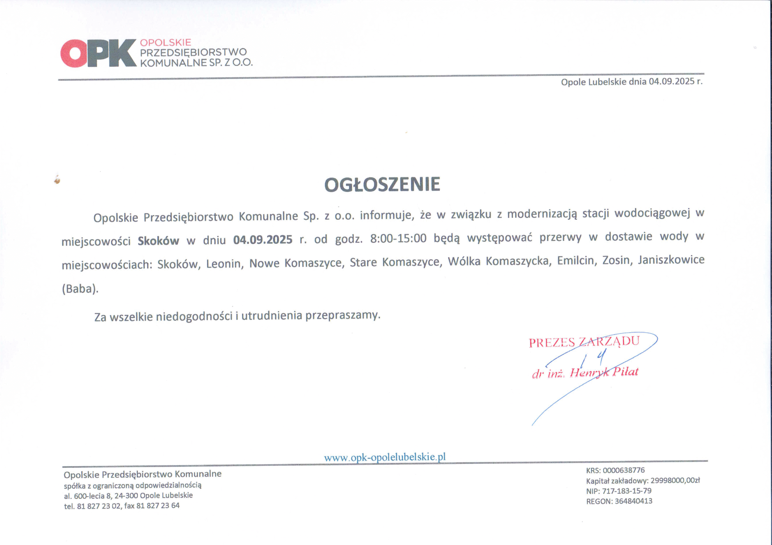W dniu 04.09.2025 r. przerwy w dostawie wody w miejscowościach: Skoków, Leonin, Nowe Komaszyce, Stare Komaszyce, Wólka Komaszycka, Emilcin, Zosin, Janiszkowice (Baba) Opublikowano przez